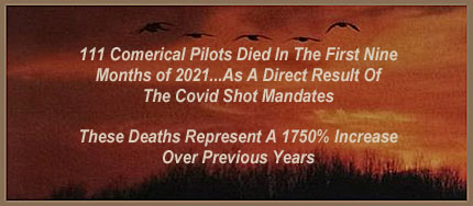 Click on the picture below to read a commentary from Global Research (globalresearch.org) about the 1750% increase in airline pilot deaths caused by Covid vaccine mandates. As a comparison, there was only 1 death in 2019--6 deaths in 2020 when pilot vaccinations started to be required--and now in 2021 there are 111 deaths--with nearly all pilots vaccinated. The death count is steadily increasing. The pro-vaccine advocates in the media and the pharmaceutical industry are doing damage control by saying that it's just "coincidental" and that there is no evidence that the Covid vaccines caused the deaths. However the now mandatory Covid shots are the only thing that has changed--since pilots must maintain impeccable health in order to fly. Nearly all the major news outlets are refusing to cover this tragedy--because it disproves their pro-vaccine narrative.